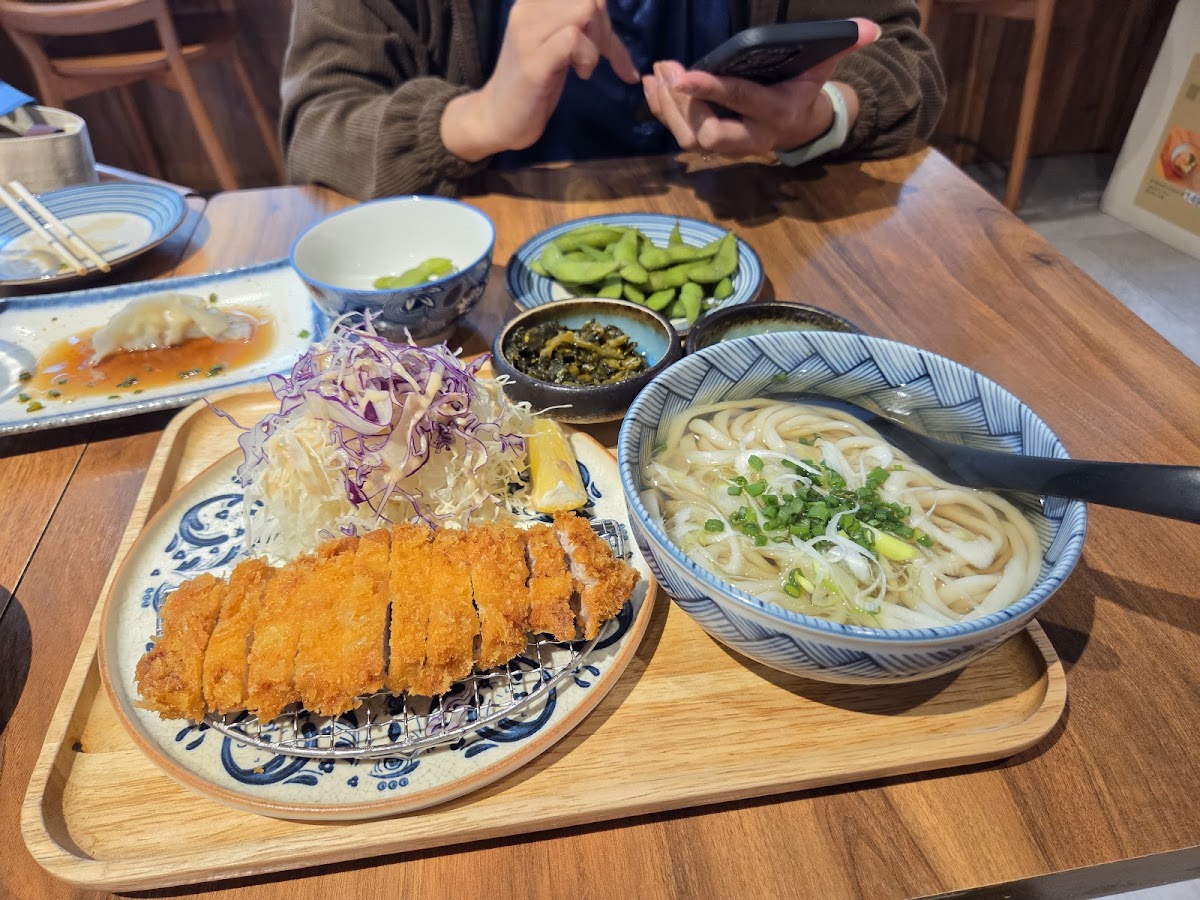 The food is decent. I got to try the recommended menu, Kurobuta Udon. It was good. The soup is sweet with clear base and the noodle is soft but not chewy. The katsu dish is good but again, it comes with the soft udon which is a bit unmatched. The good thing is the heat of the soup. It keeps steamy for sometimes! Along with that set, the udon bowl and cabbage salad can be refilled. All side dishes are alright. The best is the waitress. She's so lively and mindful serving with full service mind that reminds you of Japanese service standard.